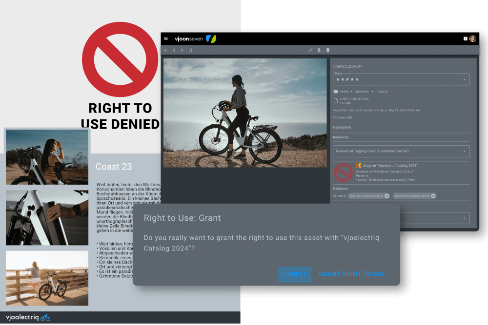 So können beispielsweise seven Nutzer das Recht zur Nutzung eines Bildes im Layout kontrollieren. Entscheidet ein Nutzer, dass ein Asset in seven aufgrund abgelaufener Bildrechte oder Lizenzen nicht mehr nutzbar ist, wird der Nutzer in vjoon K4 durch einen deutlich erkennbaren Hinweis darauf hingewiesen und kann das Bild nicht mehr verwenden.